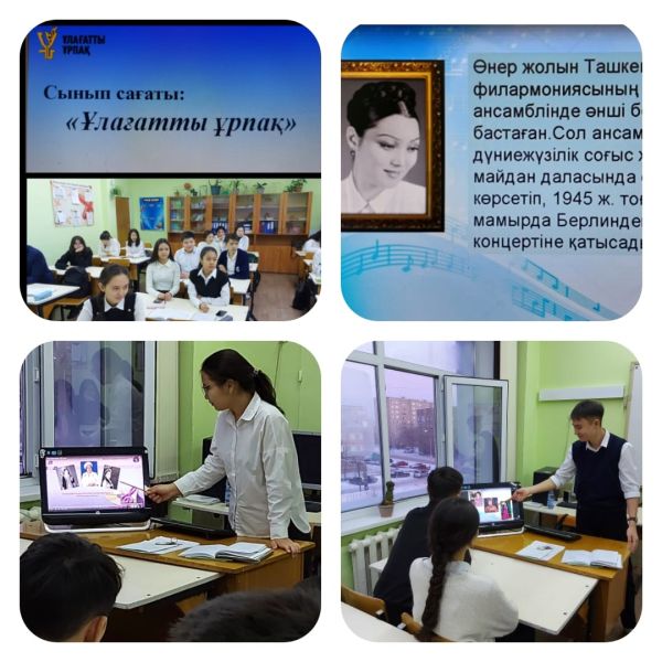 28.11.22 күні 10 "Ә" сынып оқушылармен "Ұлағатты ұрпақ" тақырыбына сынып сағаты өткізілді. Осы тақырып аясында оқушылар Қазақ халқының әншісі Р.Бағланованың өмірбаянымен танысты.