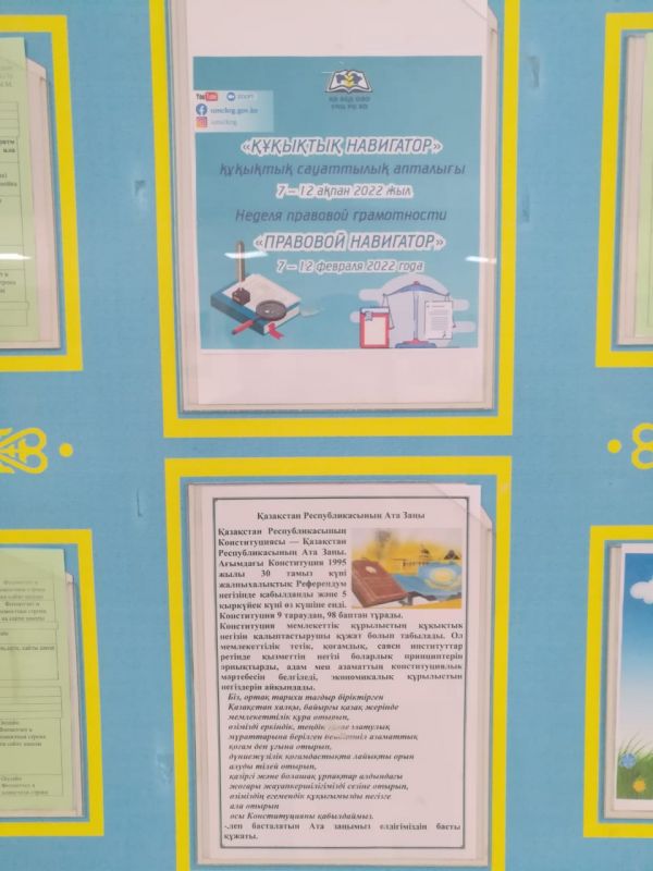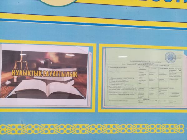 Мектеп фойесінде оқушыларға, мұғалімдерге, ата-аналарға арналған құқықтық апталық іс-шаралар жоспары бар ақпараттық стенд жасалды.