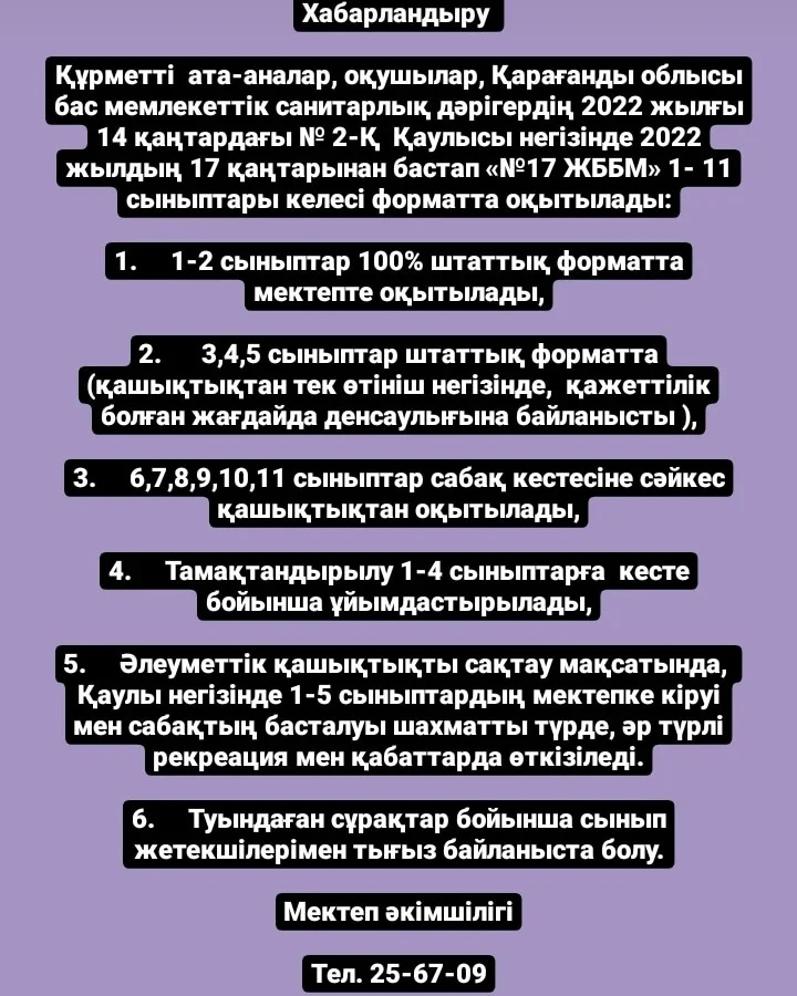 Хабарландыру Құрметті  ата-аналар, оқушылар, Қарағанды облысы бас мемлекеттік санитарлық дәрігердің 2022 жылғы 14 қаңтардағы № 2-Қ  Қаулысы негізінде 2022 жылдың 17 қаңтарынан бастап &l…