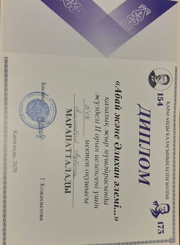 11.03.2020күні "Абай және Әлихан әлемі..."  қалалық жыр мүшәйрасында жүлделі 2-орынды мектебіміздің 8"Ә"-сынып оқушысы Аманбай Ақбота иеленді.  Жетекшісі Садуова Д.О.&n…