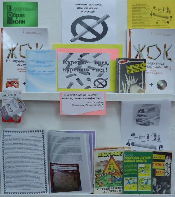 «Шылым шегу-зиян, шылым шегуге жол жоқ!» осы тақырыппен онкундікке орай мектеп кітапханасында тақырыптық кітап көрмесі рәсімделіп , оқушыларға темекі тарту зиянды зат екені т…