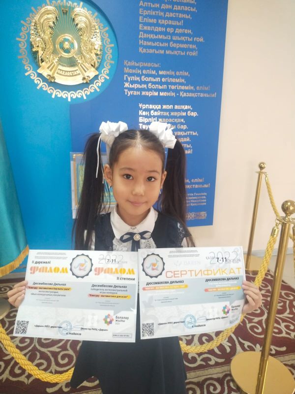 "Дарын"Республикалық ғылыми- практикалық орталығы өткізген"Кенгуру -математика барлығы үшін" интелектуалдық ойын конкурсына қатысып 2А сынып Дюсембекова Дильназ II дәрежелі дипло…
