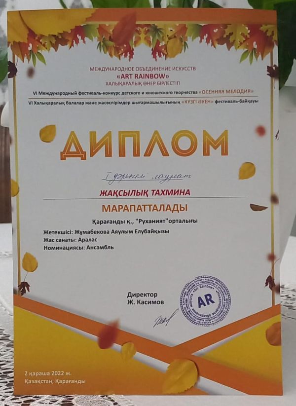 VI Халықаралық балалар және жасөспірімдер шығармашылығының "Күзгі әуен" фестиваль-байқауында 6 "А" сынып оқушысы Жақсылық Тахмина І Дәрежелі Дипломмен марапатталды