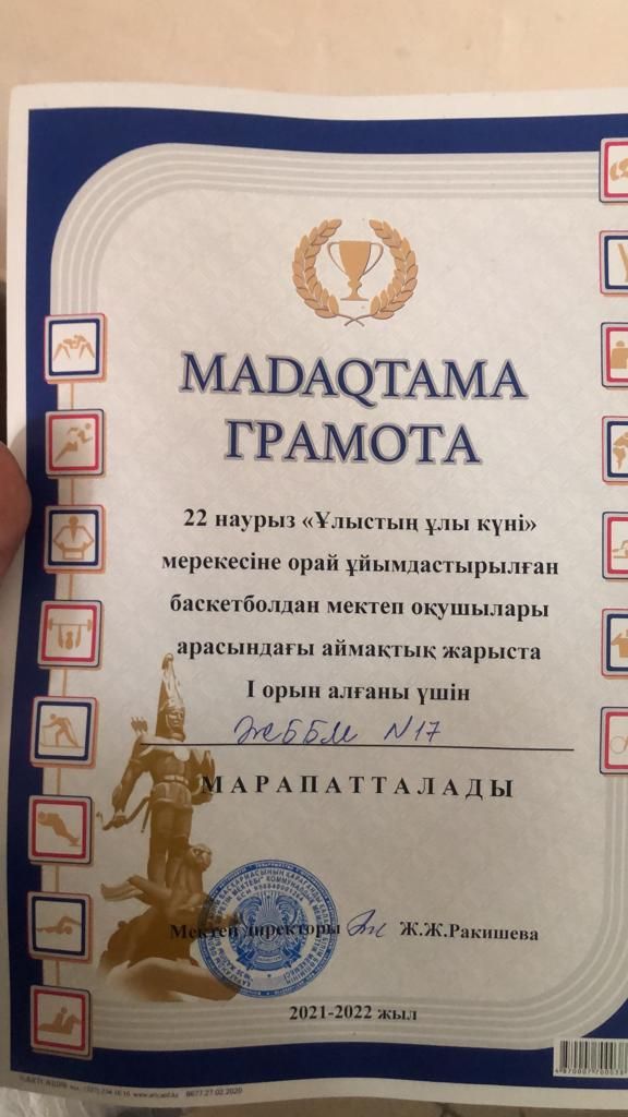 22 наурыз «Ұлыстың ұлы күні» мерекесіне орай ұйымдастырылған баскетболдан мектеп оқушылары арасындағы аймақтық жарыста І орын алғаны үшін ЖББМ17 МАРАПАТТАЛАДЫ 11 "Ә" сыны…