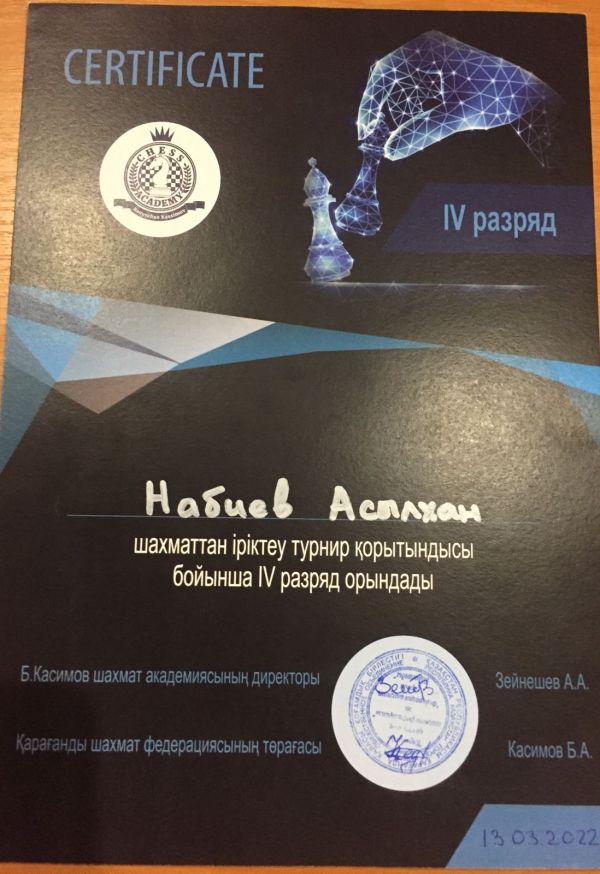 Набиев Асылхан,  ученик 3 В класса получил 4 разряд по шахматам.