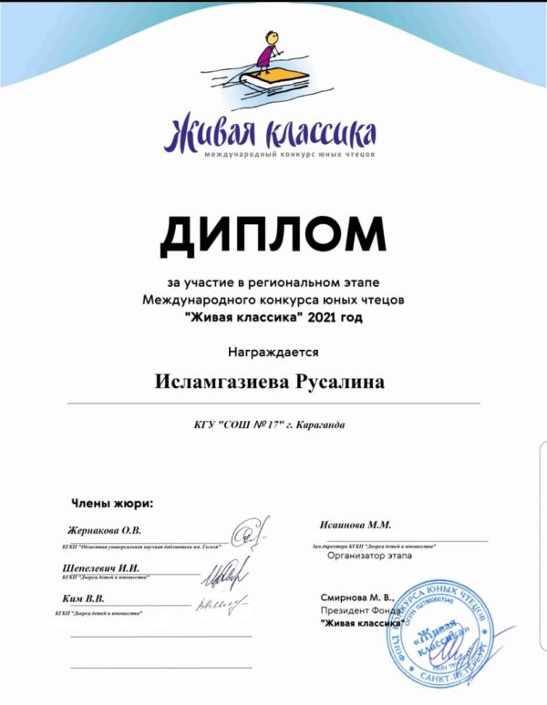За активное участие в  региональном отборочном туре Международного конкурса чтецов "Живая классика" диплом награждена Исламгазиева Русалина, ученица 8Б класса.