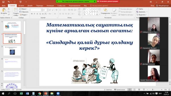 «Математика айналамызда» математикалық сауаттылық апталығы аясында 8 «А» сынып оқушыларымен «Сандарды қалай дұрыс қолдану керек?» тақырыбында Zoom платформасында…