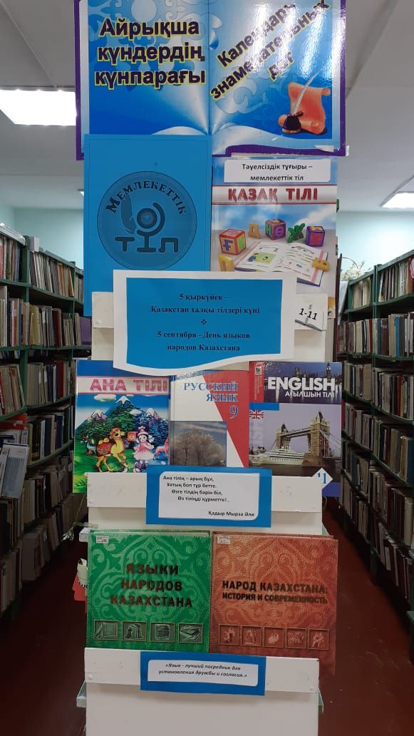 Бүгін 5 - қыркүйек Қазақстан халықтарының тілдері күні мектеп кітапханасында тақырыптық кітап сөресі ұйымдастырылды. Мақсатымыз: Тілдер күні мерекесін  дәріптеу, қазақ тілін насихаттау