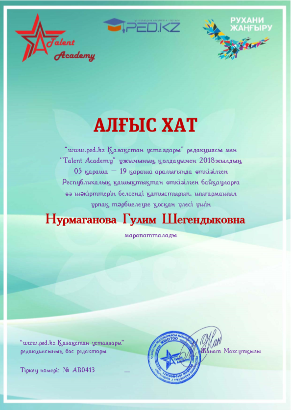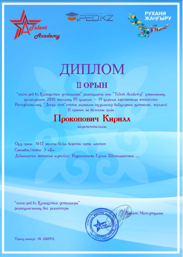 5 б сынып оқушылары Прокопович Кирилл,Мукашева Анастасия,Миланьтев Павел «www.ped.kz Қазақстан ұстаздары» редакциясы мен «Talent Academy» ұжымының қалауымен…