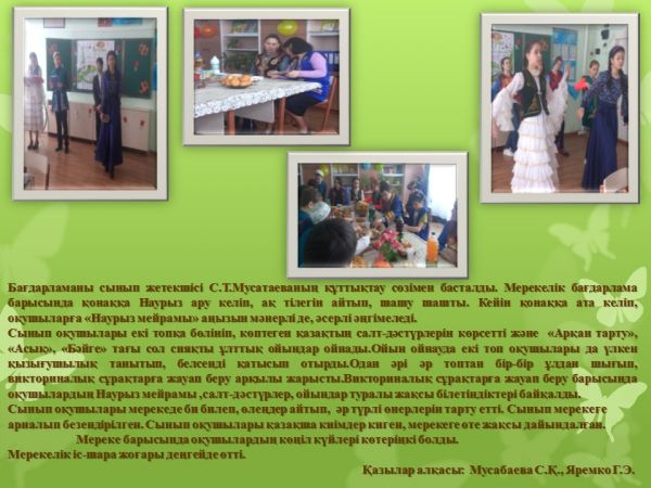10 А сыныпта «Нұр себеле, Ұлыстың Ұлы күні» тақырыбында тәрбие сағаты өтті. Оқушылар «Қынаменде» салт – дәстүрін көрсетті!