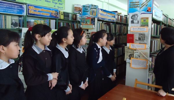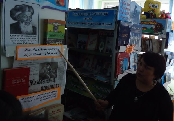 Бүгін кітапханамызда ақын, жыршы, жырау Жамбыл Жабаевтың дүниеге келгеніне 170 жыл толуына орай тақырыптық көрме ұйымдастырылды.     Оқушылар Жамбыл атамыздың өм…