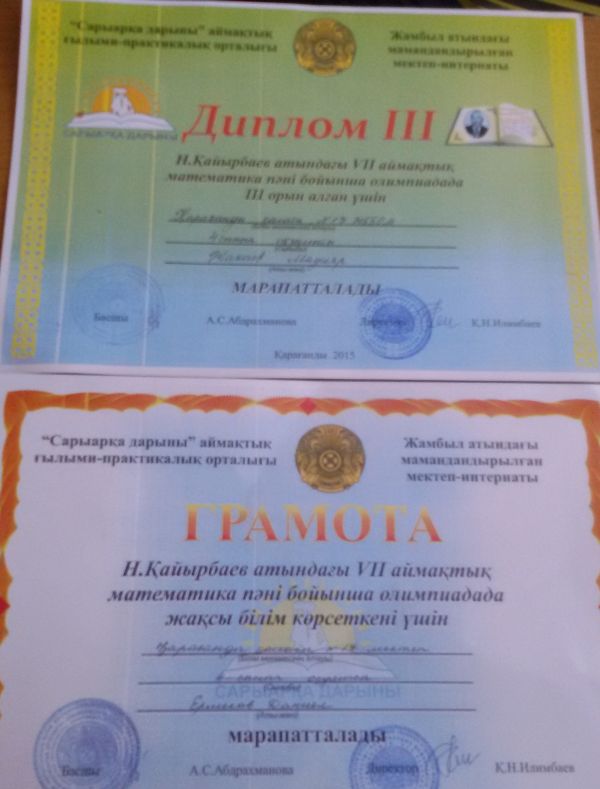 Жамбыл атындағы №7 ММИ өткзілген Н.Қайырбаев атындағы VII аймақтық математика пәні бойынша олимпиадада III орын алғаны үшін 4 «а» сынып оқушысы Жахаев Мадияр және жақсы білім көрсеткені…