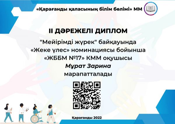 "Мейірімді жүрек" байқауы. Мектеп парламентінің "Еріктілер" секторына жауапты Мұрат Зарина "Жеке үлес" номинациясы бойынша қалалық байқаудан 2 орынға ие болды.Құттықтай…