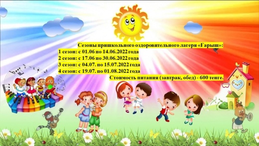 Сезоны пришкольного оздоровительного лагеря «Ғарыш»: 1 сезон: с 01.06 по 14.06.2022 года 2 сезон: с 17.06 по 30.06.2022 года 3 сезон: с 04.07. по 15.07.2022 года 4 сезон: с 19.07…