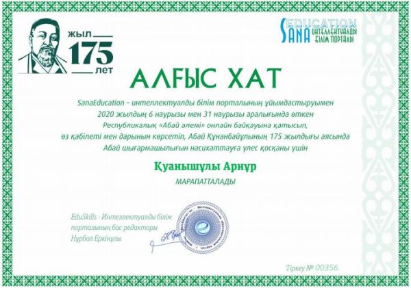 Республикалық Өрлеу порталының "Біз біргеміз, Біз үйдеміз" атты байқауға қатысқаны үшін Мауина З.Б. Жакупова Ж.Т. сертификатпен марапатталды! Еңбектеріңіздің жемісін көре беріңіздер