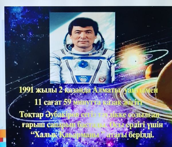 12 сәуір -ғарышкерлер күніне орай "1 Ә" сыныбында адамзаттың ортақ үйі Жер планетасына, ғарыш әлеміне деген сүйіспеншілікке тәрбиелеу мақсатында "Қазақтың тұңғыш ғарышкерлері" та…
