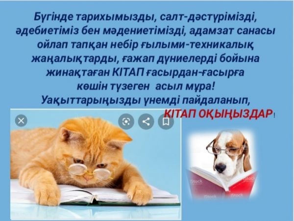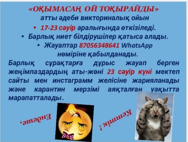 Құрметті оқушылар, ұстаздар, ата-аналар! 23 сәуір – Халықаралық кітап және авторлық құқықты қорғау күніне орай 16 -23 сәуір аралығында өтетін «Оқымасаң ой тоқырайды» атты әдеби вик…