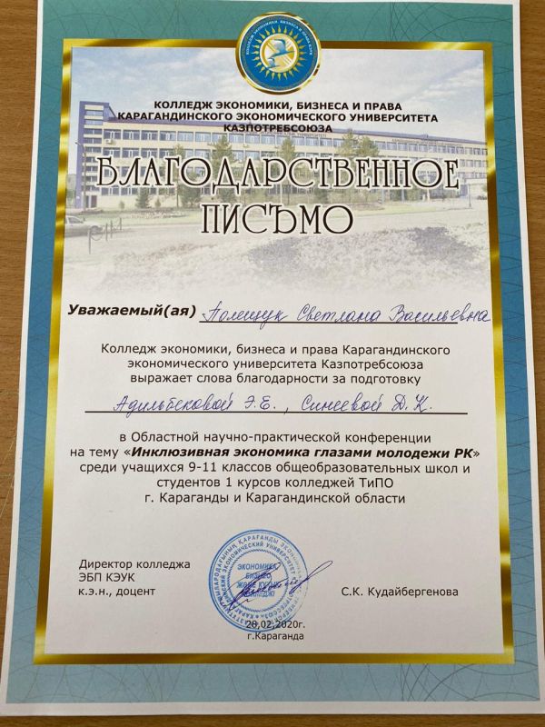 Ученицы 10 «А» класса Адильбекова Эмилия и Синеева Дильназ приняли участие в областной научно-практической конференции «Инклюзивная экономика глазами молодежи» (руководитель:…