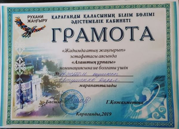 "Жадымда атың жаңғырып" эстафетасы аясында "Алаштың ұрпағы" номинациясына ие болғаны үшін №17 ЖББОМ оқушысы Евтушенко Дарья марапатталады.