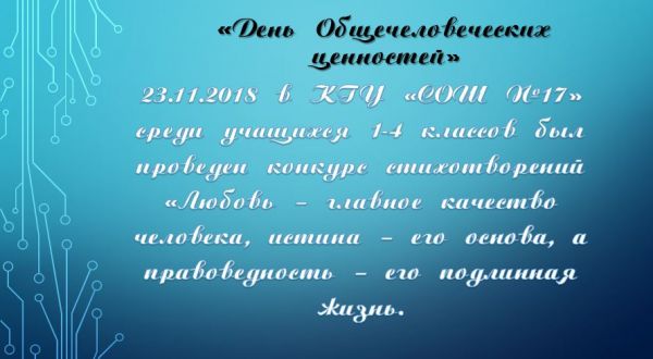 №17 ЖББО мектебінде «Сүйіспеншілік-адамның басты қасиеті,ақиқат-оның негізі,дұрыс әрекет оның шынайы өмірі» тақырыбында  4  сыныптар арасында эссе жазудан,мәнерлеп оқудан сайыс…