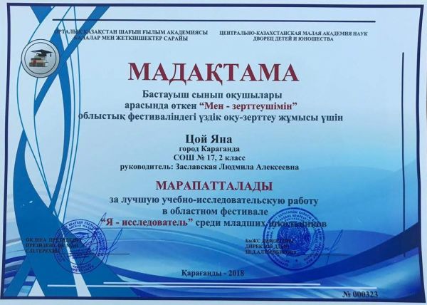 26 октября состоялось вручения грамот победителям заочного конкурса проект а МАН РК среди младших школьников. Цой Яна 2 "Б" класс получила грамоту за лучшую научно-исследовательскую работу…