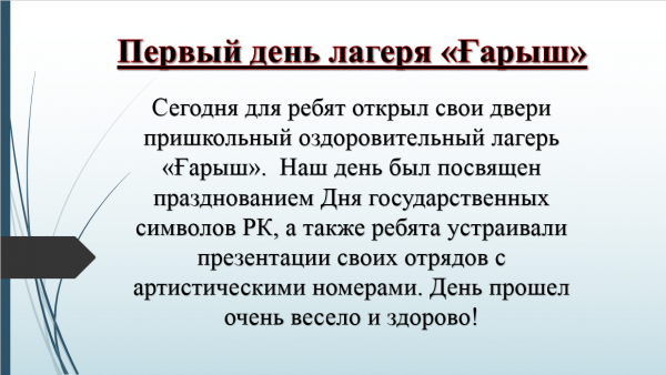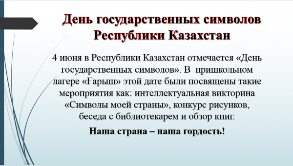 Жазғы  мектеп оқушыларымен  4 маусым -  Қазақстан  Республикасының Мемлекеттік рәміздер күніне орай сынып сағаты өткізілді.