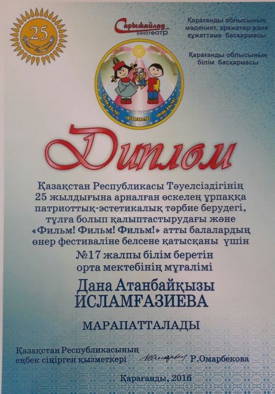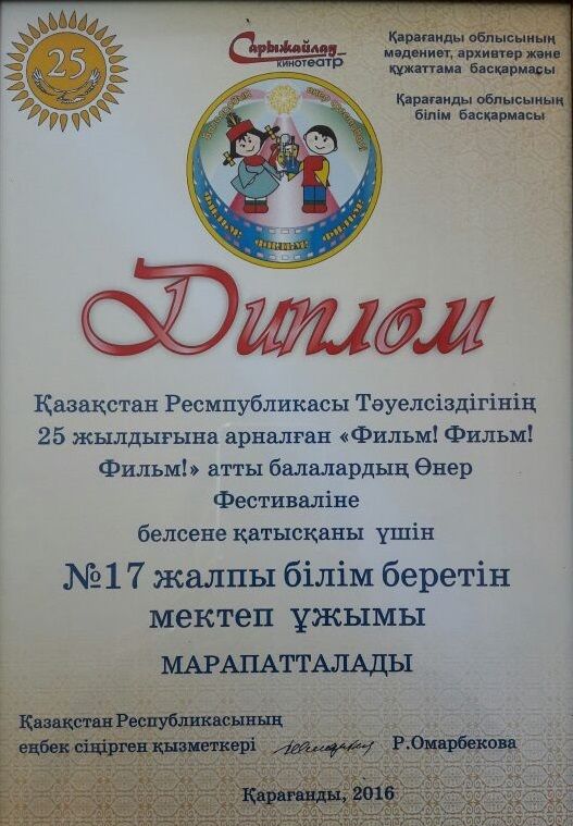 Поздравляем всех участников с награждением дипломов в детском фестивале искусств "Фильм! Фильм! Фильм!", посвященное к 25-летию Независимости Республики Казахстан.