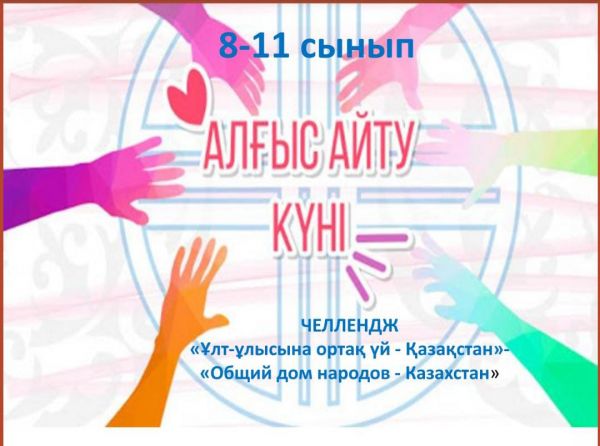 1-наурыз «Алғыс айту» күніне орай 8-11 сынып аралығында «Ұлт-ұлысына ортақ үй - Қазақстан» - «Общий дом народов - Казахстан» челленджі ұйымдастырылды.