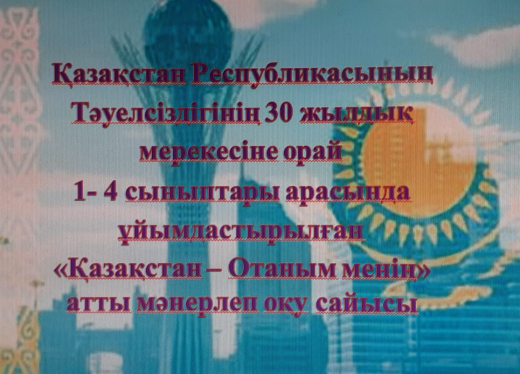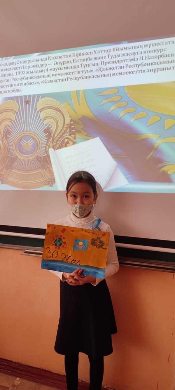 Қазақстан Республикасының 30 жылдығына орай 4 А сыныбында "Тәуелсіздігім мақтанышым" атты сынып сағаты өтті.