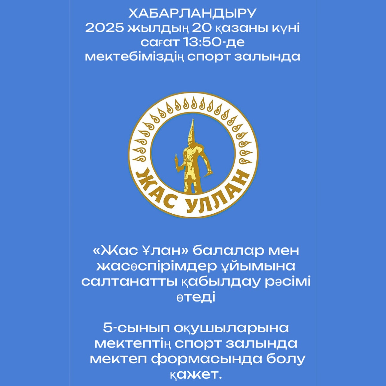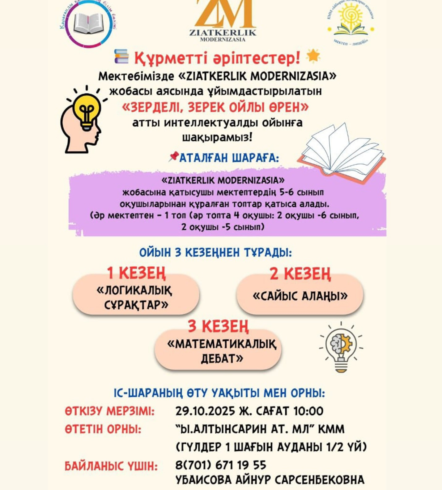 Мектебімізде «ZIATKERLIK MODERNIZASIA» жобасы аясында ұйымдастырылатын «ЗЕРДЕЛІ, ЗЕРЕК ОЙЛЫ ӨРЕН» атты интеллектуалды ойынға шақырамыз!
