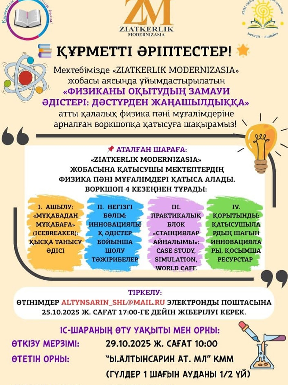 Мектебімізде «ZIATKERLIK MODERNIZASIA» жобасы аясында ұйымдастырылатын «ФИЗИКАНЫ ОҚЫТУДЫҢ ЗАМАУИ ӘДІСТЕРІ: ДӘСТҮРДЕН ЖАҢАШЫЛДЫҚҚА» атты қалалық…