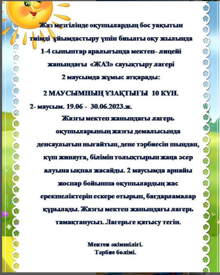 Бүгін балалар мектеп жаңындағы «Жаз» лагерінің 2 маусымына келді. Лагерьдегі тәрбиешілерімен танысып, ойындар ойнады.