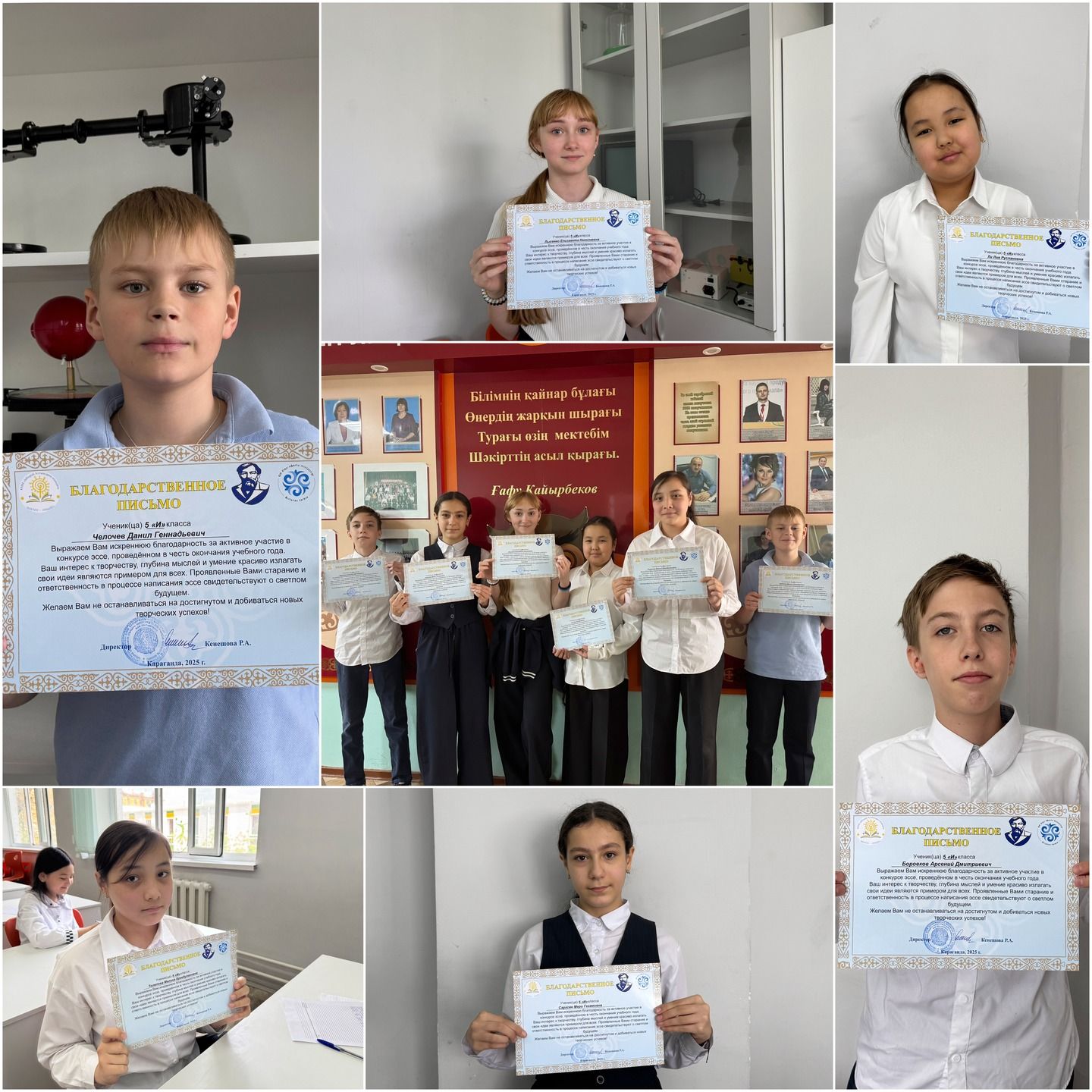 5 и сынып оқушылары оқу жылының аяқталуына орай өткізілген эссе байқауына белсенді қатысқаны үшін алғыс хаттармен марапатталды.