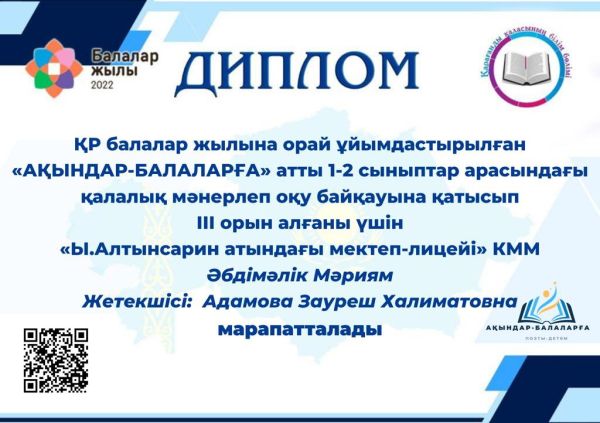 атты қалалық байқауына қатысқан оқушыларды марапаттау рәсімі өтті!