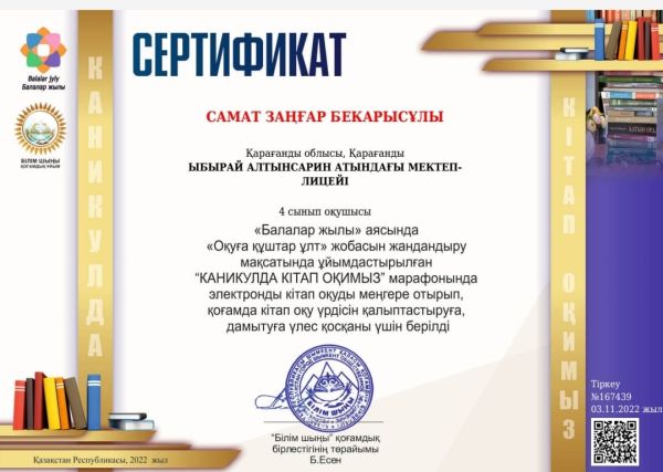 “Балалар жылы-2022 ж” “Оқуға құштар ұлт” Каникулда кітап оқимыз марафонына 4 “Б “сынып оқушысы Нығман Нұрислам қатысып, марапатталды. Сынып жетекшісі: Момынбекова…