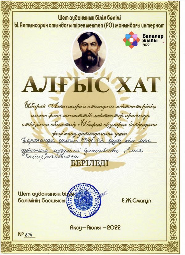 Ыбырай Алтынсарин атындағы мектептерінің альянс және магниттік мектептер арасында өткізілген облыстық «Ыбырай оқулары» байқауына қатысып, «Дала жұлдызы - Ыбырай» Ыбырай шығар…