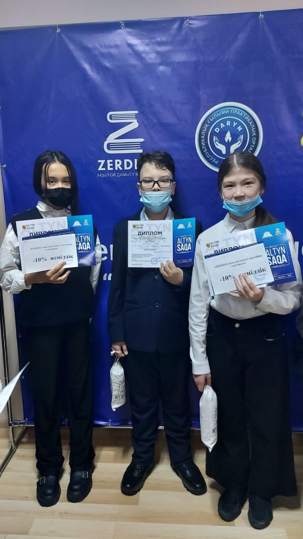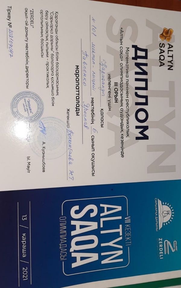 Математика пәнінен республикалық «Алтын сақа» олимпиадасының аудандық кезеңінде ІІІ орынға ие болып, облыстық кезеңге өткен Кайырбекова Бұлбұл 6 «А» сынып, Амантай Еркежа…