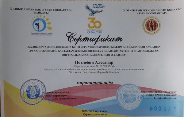 В Х открытом региональном конкурсе «Туған Соқпақтар», Абаев Асанали занял 3 место, Похлебин Александр сертификат за участие.