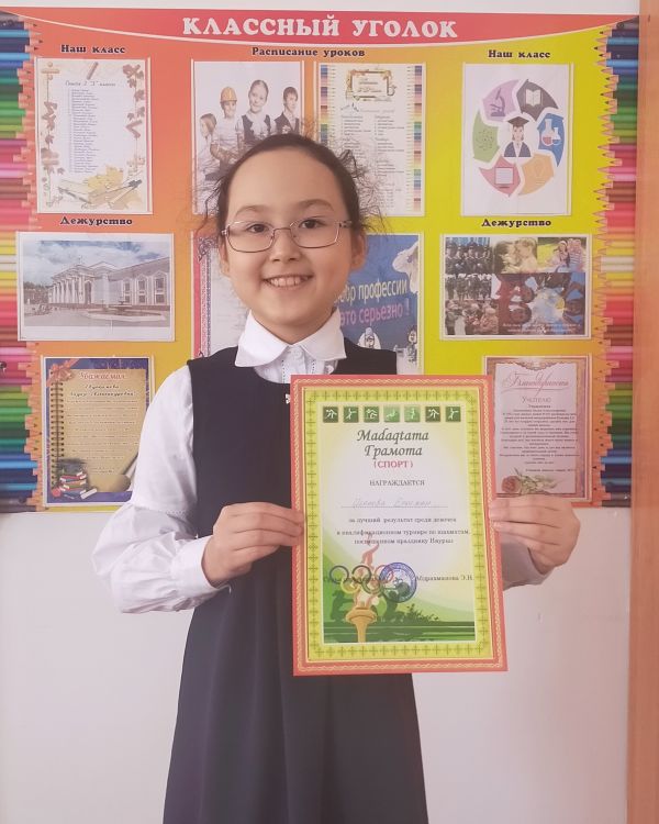 В квалификационном турнире по шахматам Еркежан была награждена грамотой за лучший результат среди девочек.