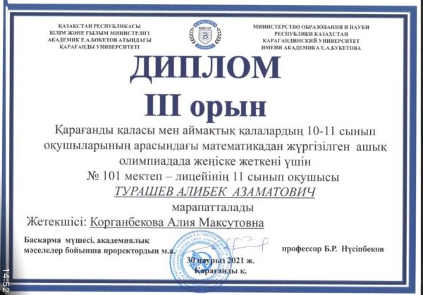 Қарағанды қаласы мен аймақтық қалалардың 10-11 сынып оқушыларының арасындағы математикадан жүргізілген ашық олимпиадада 10Ә сынып оқушысы Жуканов Аскар 2-орын және 11Ә сынып оқушысы Турашев Алибек 3…