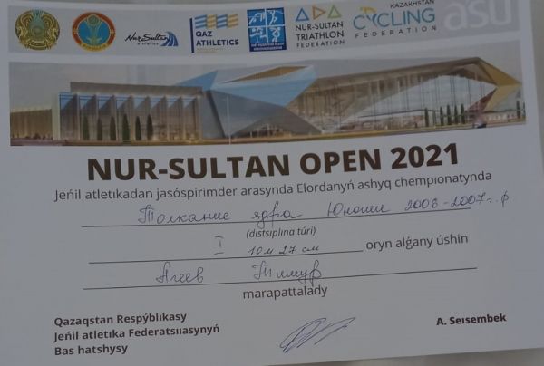 Агеева Тимура, ученика 8 «Д» класса за занятое 1 место на соревнованиях по легкой атлетике «NUR-SULTAN OPEN 2021».
