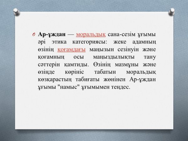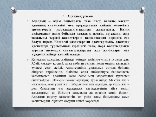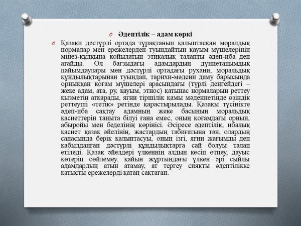 Ар – ұждан, намыс ұят, абырой туралы дұрыс, жағымды көзқарас қалыптастыра отырып, оларға адалдық пен әділдік, әдептілік пен сыпайылық, кішіпейілділік пен мейірімділік, ізгілік пен имандылық қа…