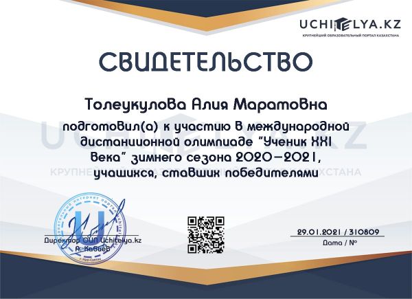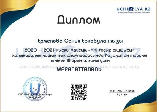 "XXl ғасыр оқушысы" халықаралық қашықтық олимпиадасында Қазақстан тарихы пәнінен үшінші орын алғаны үшін 5 "в" сынып оқушысы Ермекова Сания марапатталды. Құттықтаймыз! Тек алға!