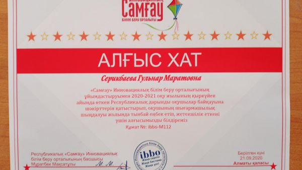 "Самғау" Инновациялық білім беру орталығының ұйымдастыруымен 2020-2021 оқу жылының қыркүйек айында өткен Республикалық дарынды оқушылар арасында қашықтықтан өткізілген қонкурсқа #10…
