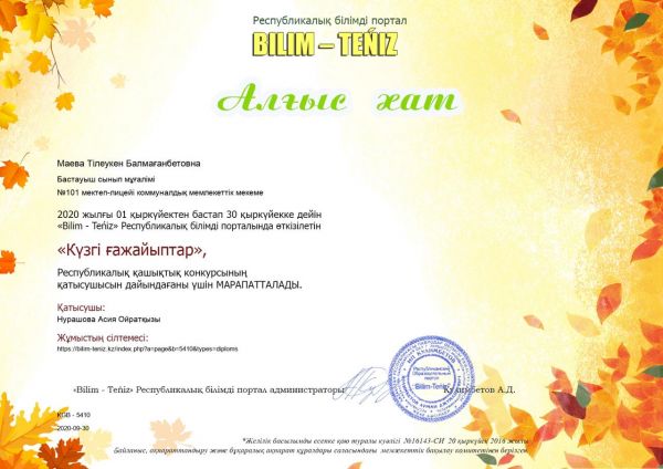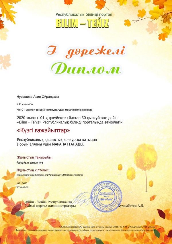 Күзгі ғажайыптар Республикалық қашықтық конкурсқа қатысып 1 дәрижелі ДИПЛОМ иеленген 101 мектеп-лицейінің 2ә сынып оқушысы Нурашова Асияны құттықтаймыз.