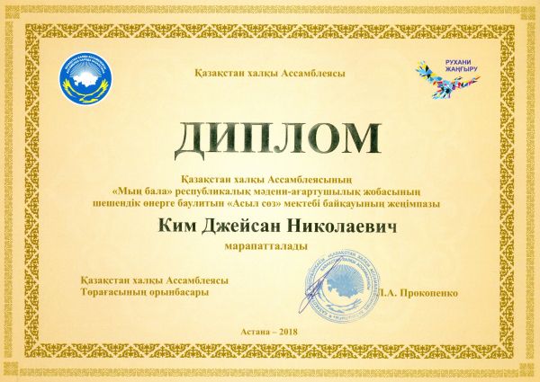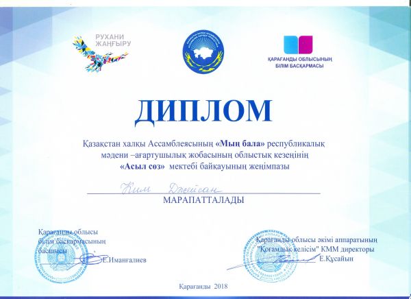 №101 мектеп-лицейінің 11 "А" сынып оқушысы Ким Джейсан Қазақстан Халқы Ассамблеясының "Мың бала" Республикалық мәдени-ағартушылық байқауының облыстық кезеңінен жеңімпаз болып,&nb…