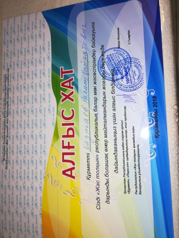 4 «А» сынып оқушысы Азанбаева Адель II дәрежелі  дипломмен марапатталды. Шығармашылық табыс тілейміз.  Сынып жетекшісі: Айдарханова Гульбарам Кусайновна