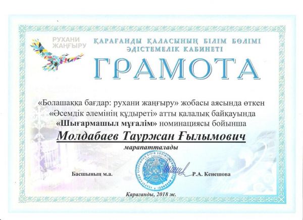 "Әсемдік әлемінің кұдыреті" атты қалалық байқауының қорытындысы бойынша эстетикалық цикл мұғалімдері үшін Л.В. Пономарева мен Г.К.Кайырберлина "Көркем еңбек" мұғалімі сертификаты…