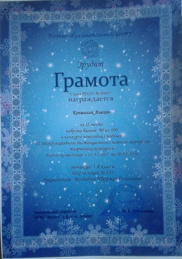 НОЦ «Эрудит» орталығының ұйымдастыруымен өткен VI Халықаралық қысқы бұйымдар жасау шығармашылық конкурсына 5 «А» сынып оқушысы Кеңшілік Әлихан қатысып жүлделі II орынды иелен…