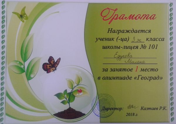 5 ақпанда «Геоград» жобасы аясында олимпиада өтті. 3 Ж сынып оқушылары Едукова Милана – 1 орын, Боранбаев Алихан мен Воробьева Дарья – 2 орын иеленді. Сынып жетекшісі Е.Ф. Бо…